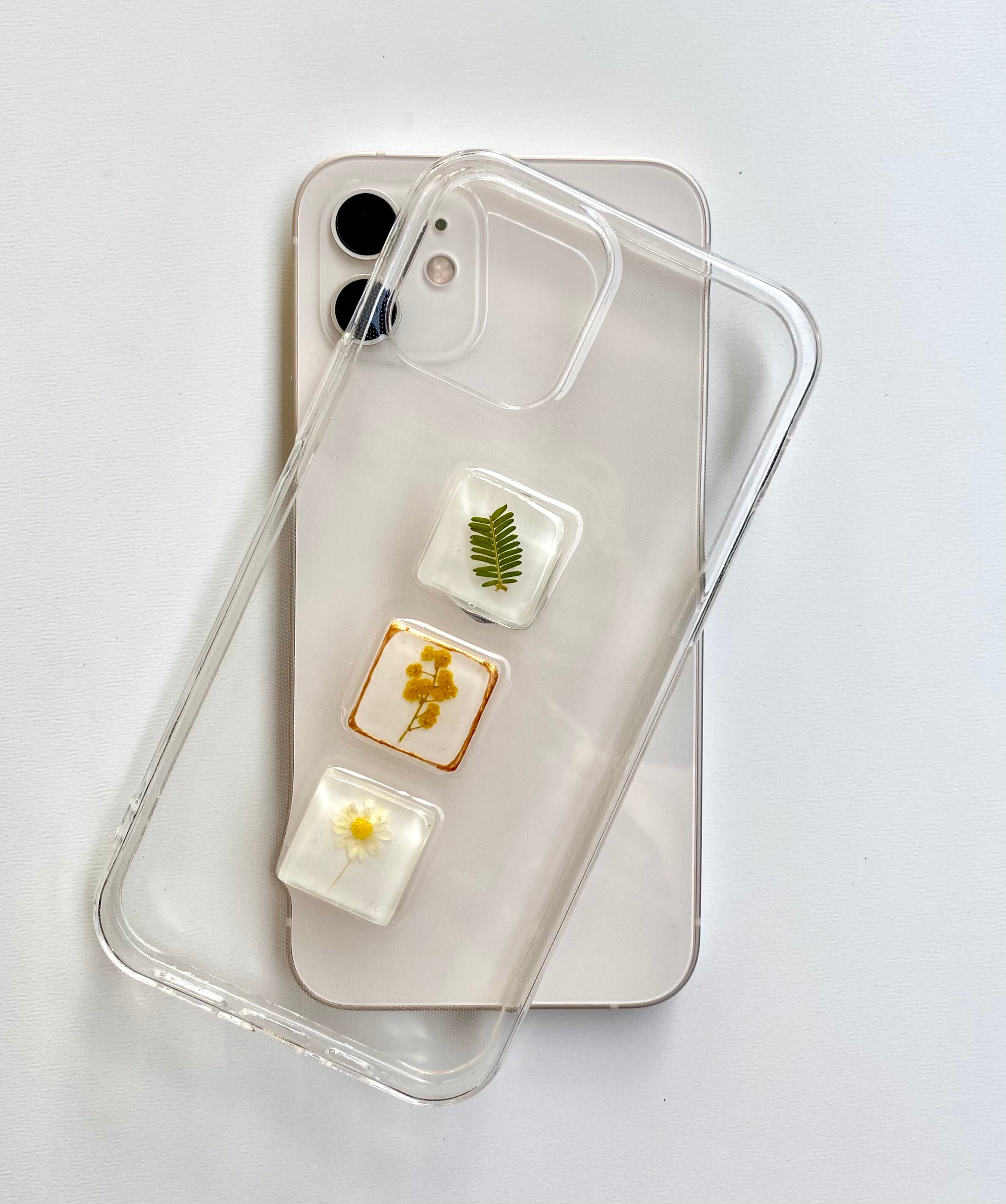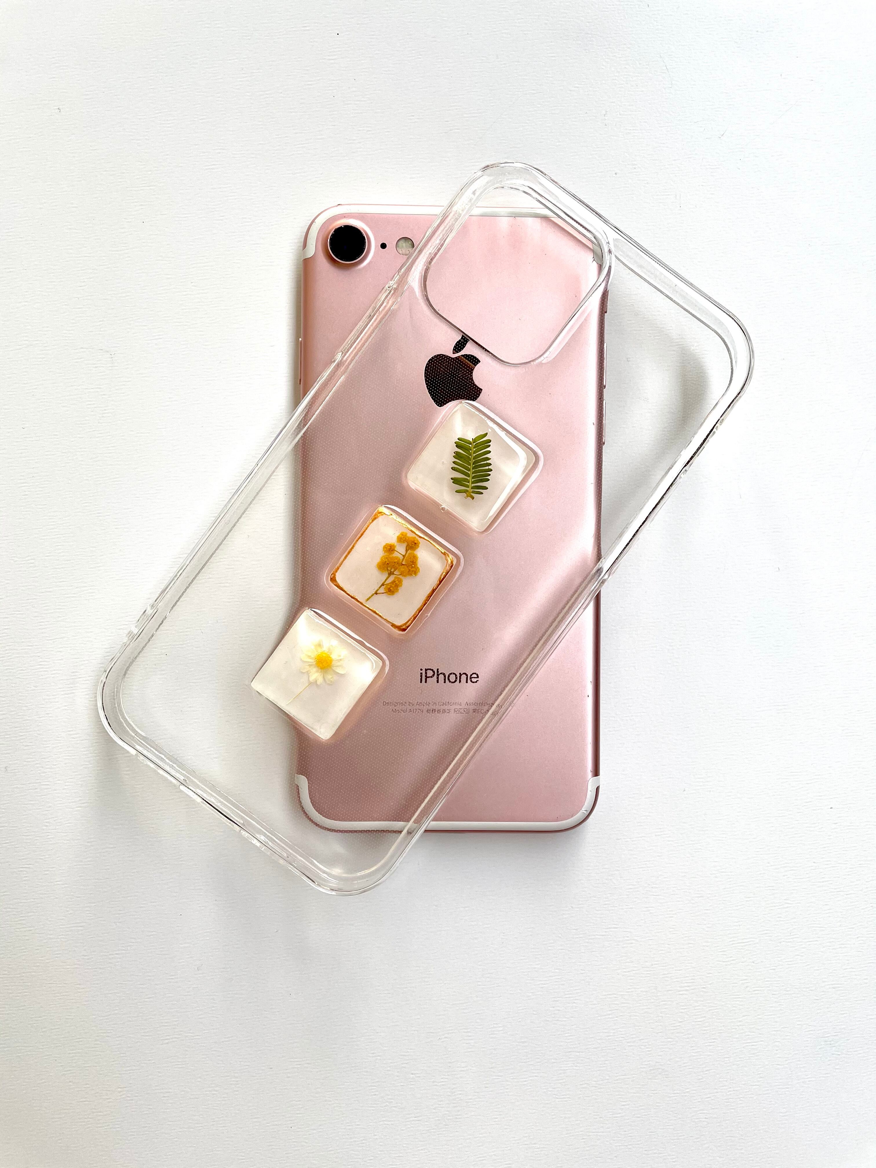クリアハードケースを使用しております。本物のお花やフルーツなどを使用しているため、一つ一つの色や大きさが若干異なります。