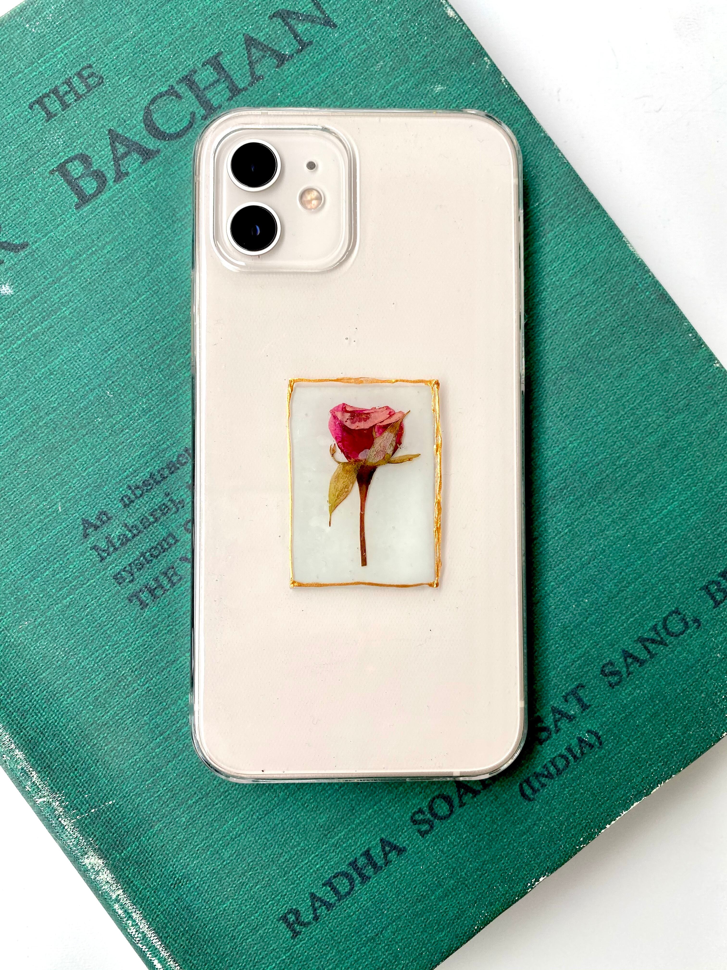 クリアハードケースを使用しております。本物のお花やフルーツなどを使用しているため、一つ一つの色や大きさが若干異なります。